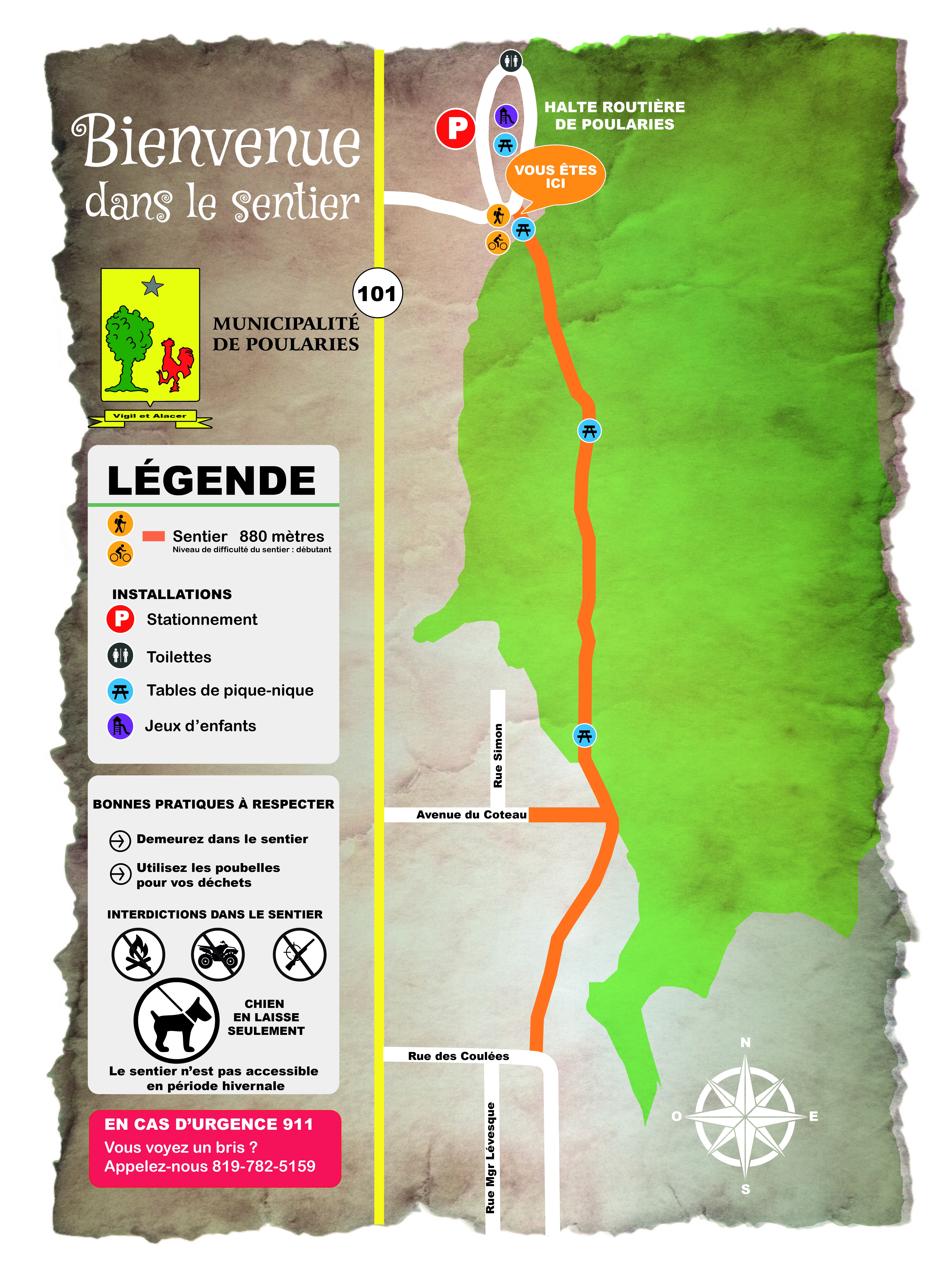 Le sentier relie la halte routière au village de Poularies. Le stationnement spacieux donne accès à des tables de pique-nique, à des toilettes et à une aire de jeux.